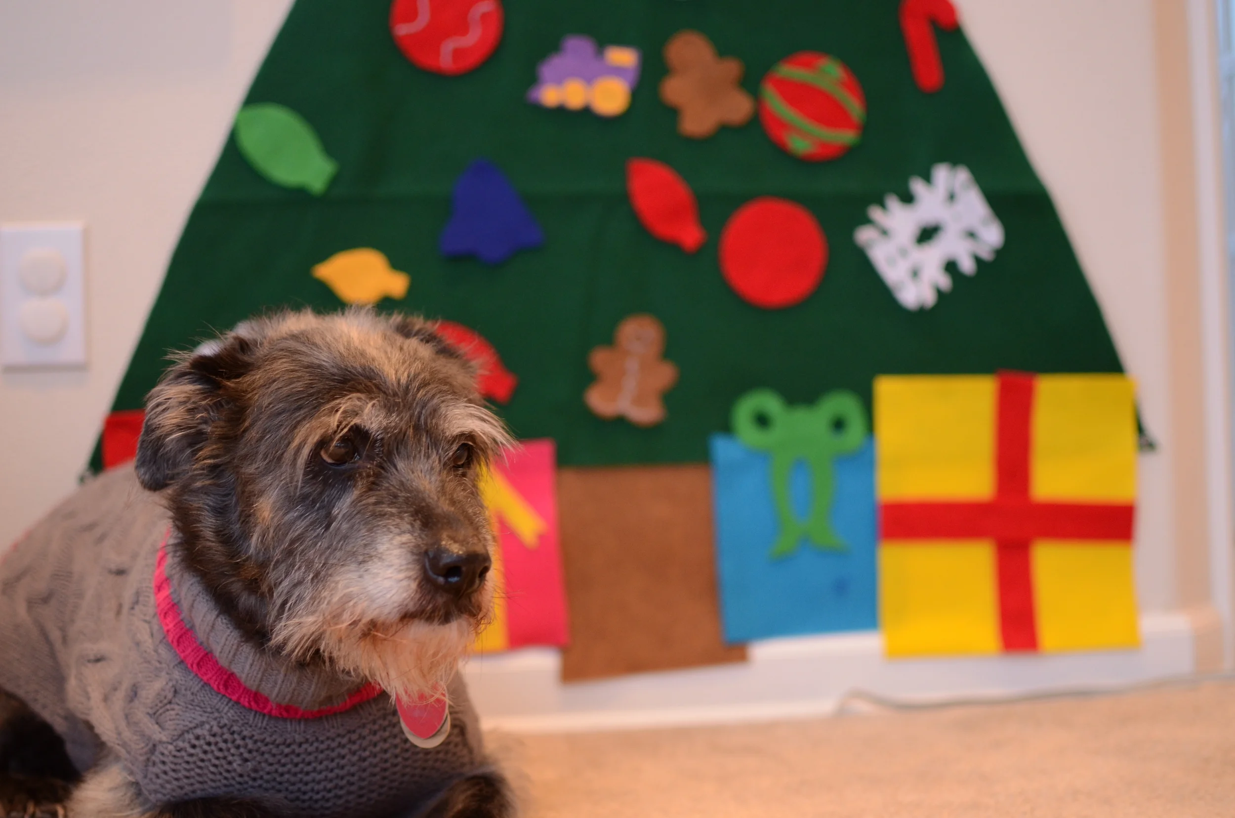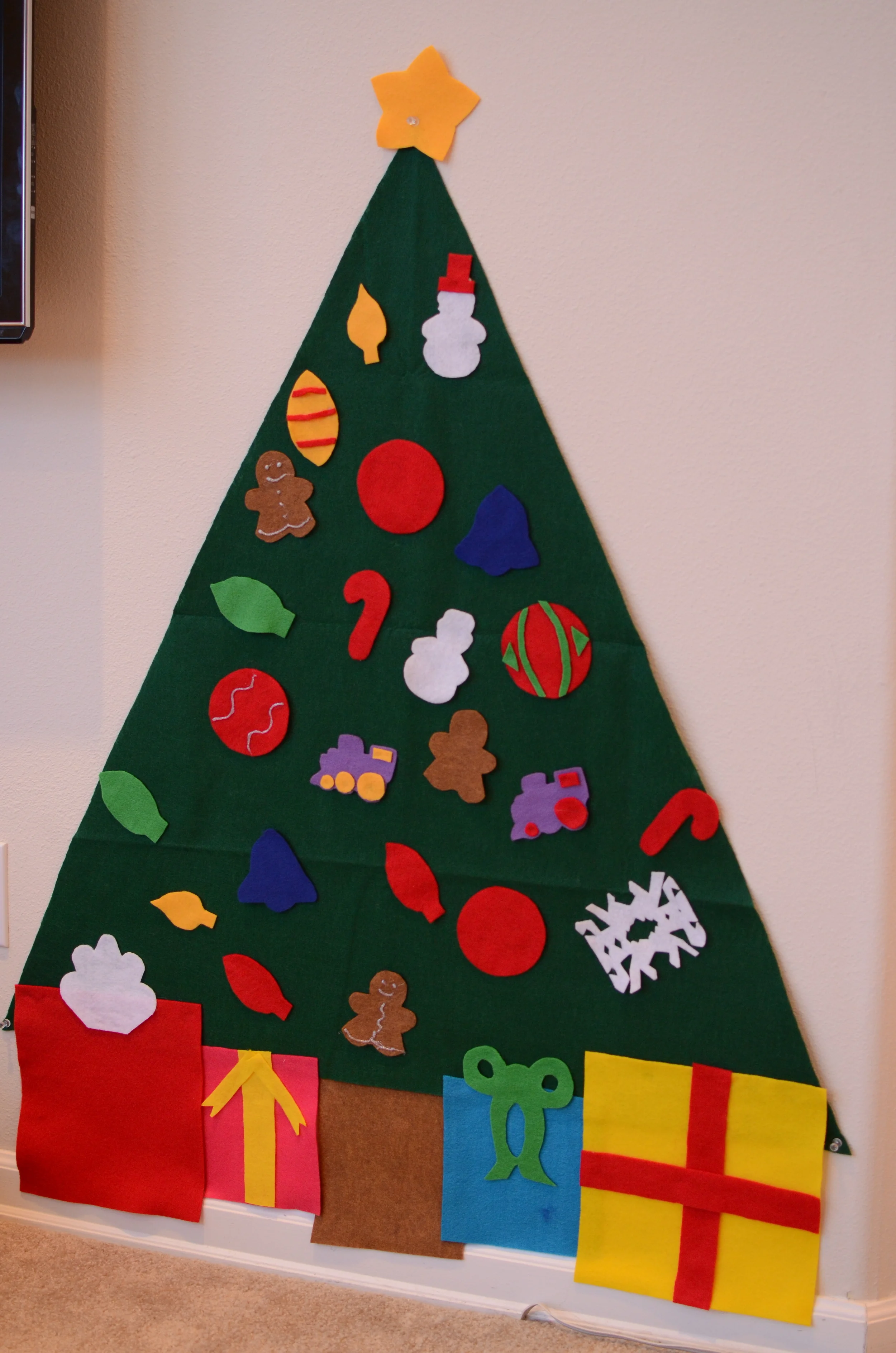Of course, he kept trying to pull off the presents at the bottom too - which are glued on. So it required a little bit of oversight to make sure the whole thing wasn't ripped off the wall. Next year I'll probably find a better way of securing it than push pins... "/