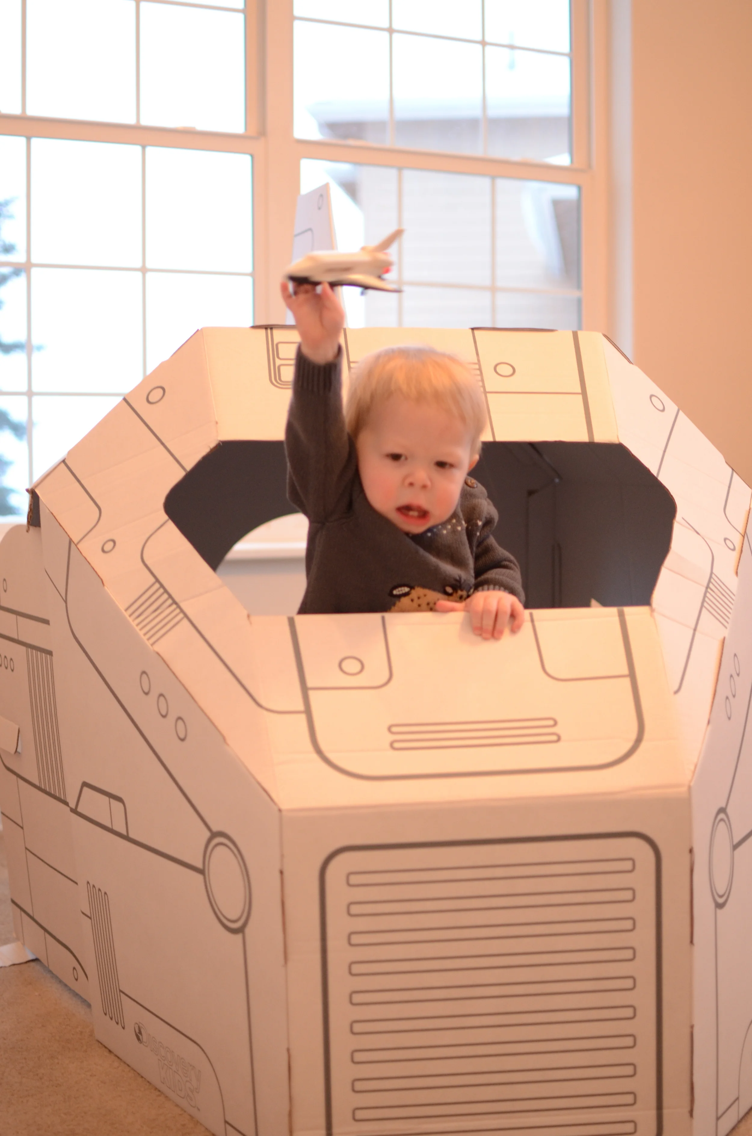 Also high on the list of indoor entertainment, Thomas' cardboard space shuttle. Seen here throwing a toy space shuttle from inside the space shuttle...