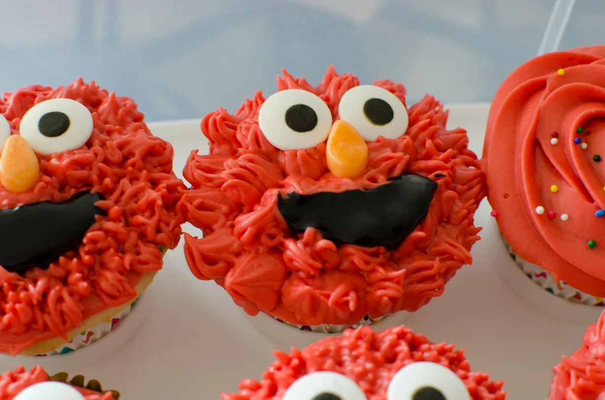 But when I showed the Elmo obsessed toddler, he would not say "Elmo". Eventually, he saw his snack container that had Elmo on the cover behind the cupcakes and pointed to that and said "Elmo"! But no dice on the cupcakes! To be fair, the pictures make the red look a little better than it was in real life. It was definitely not Elmo red, but I couldn't put any more red dye in the frosting. I mean, I'm giving these to other people's kids and you always hear that red dye isn't that great for children. So I had to draw a line somewhere, and that line was "muted red"...