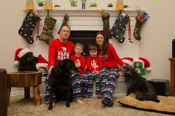 Just like the last 4 years, we got matching Christmas pjs! We went back to a traditional Christmas look this year instead of the Star Wars ones we did last year. And since there was still a giant oven next to the Christmas tree, we switched to the fireplace for photos this year!